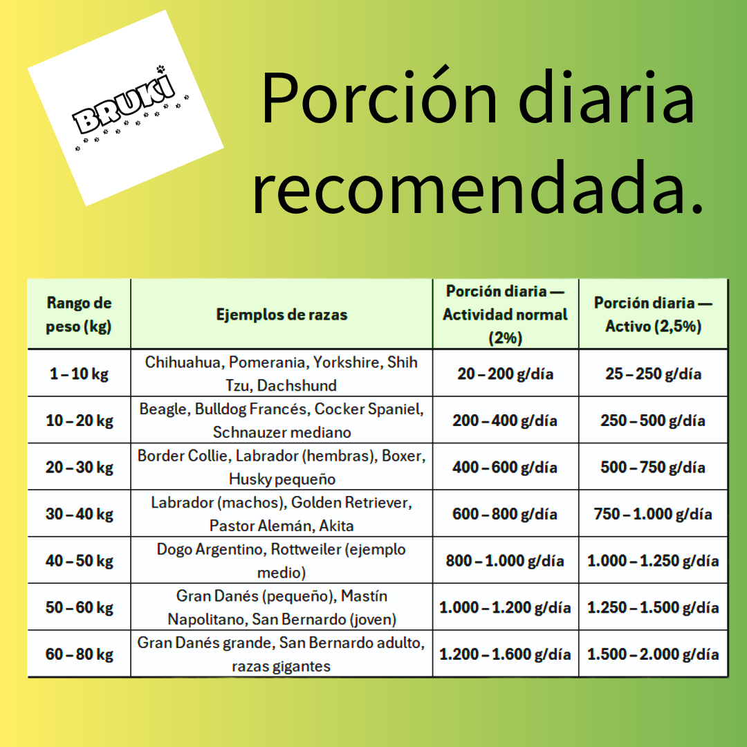 Estas cantidades sirven como punto de partida, pero en Bruki creemos que cada perrito es único, por eso calcular la ración exacta es fundamental para obtener los mejores resultados: más energía, mejor digestión, pelaje brillante y bienestar general.